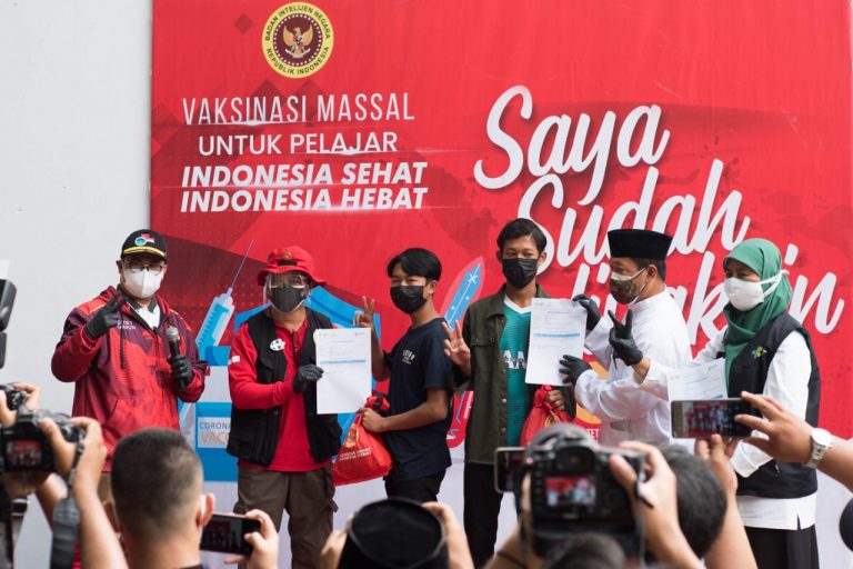 Karawang (2/8). Ponpes Sumber Barokah menjadi lokasi vaksinasi massal 1.000 santri yang diadakan Badan Intelijen Negara (BIN) bekerjasama dengan Dinas Kesehatan Kabupaten Karawang. Pemerintah menargetkan 70 persen herd imunity, terutama para pelajar dan santri agar kegiatan tatap muka bisa berjalan.