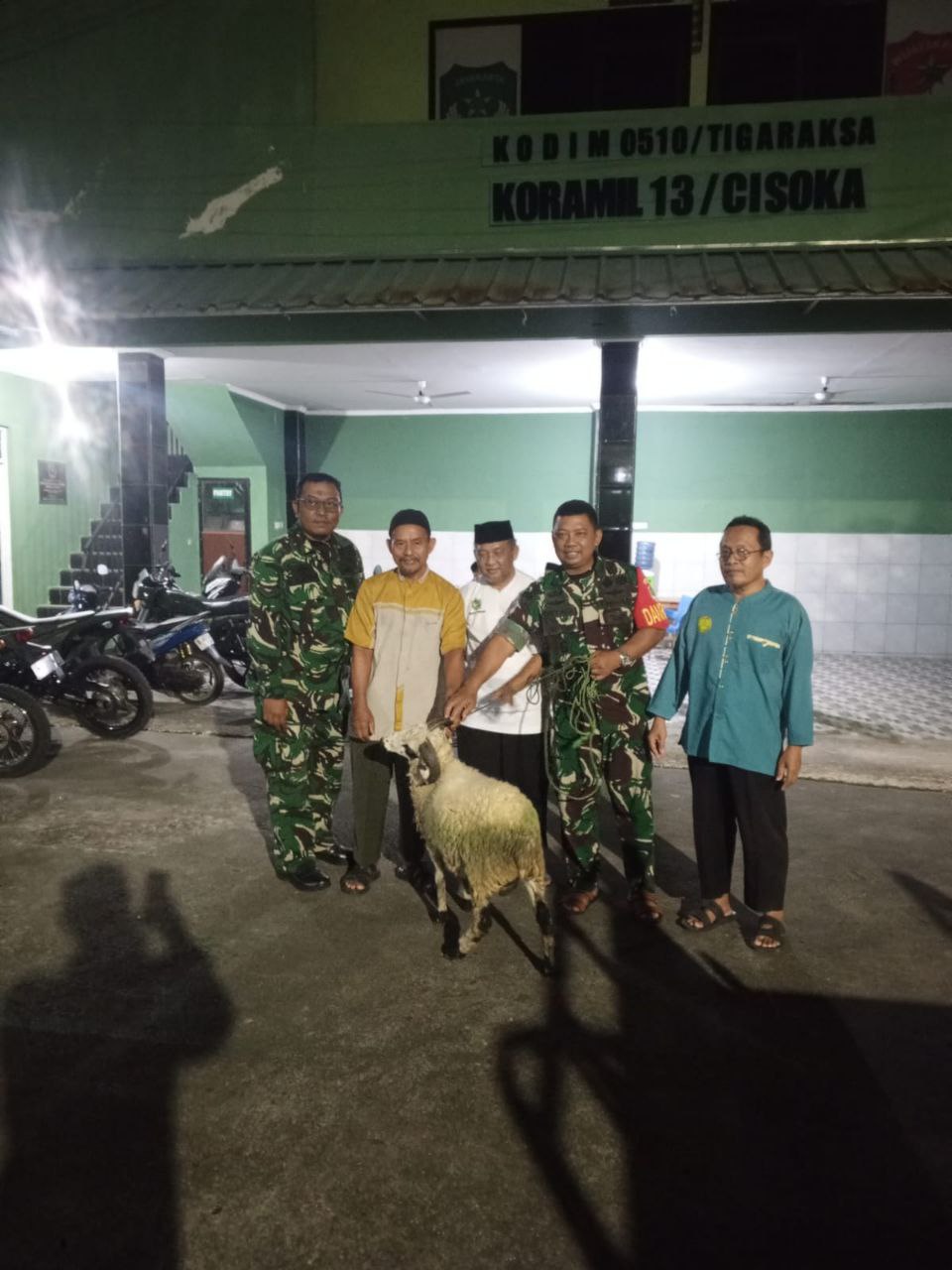 Tangerang (11/6). Koramil 13/Cisoka, Danramil 13/BP Kapten Infanteri Triyadi menyerahkan hewan kurban kepada organisasi kemasyarakatan (ormas) Islam di Solear. Penyerahan secara simbolis dilakukan di Jalan Raya Munjul Kampung Ranca Gede, Solear, Kabupaten Tangerang, Banten, pada Kamis (5/6).
