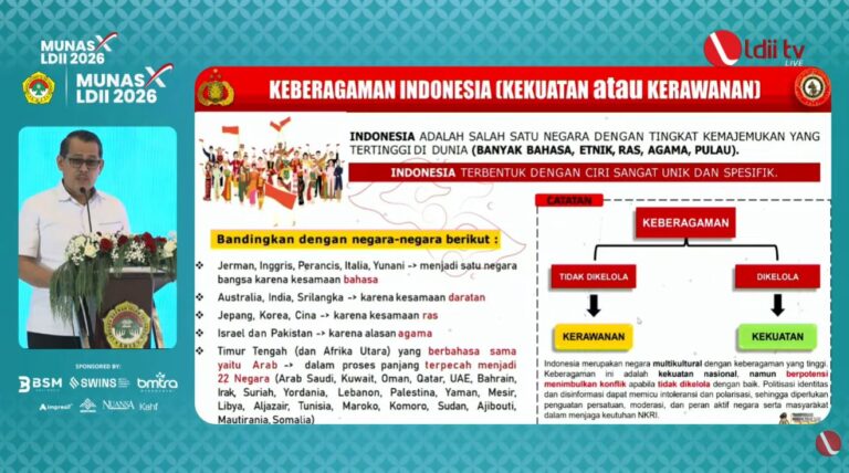Jakarta (8/4). Tantangan geopolitik dan ekonomi yang diperkuat oleh arus informasi media sosial menjadi perhatian dalam Munas X LDII, dengan Polri mendorong peran aktif ormas dalam menjaga stabilitas dan keutuhan sosial bangsa. Hal itu disampaikan Kasubdit 3 Ditjen Sosial Budaya Baintelkam Polri, Kombes Pol. Agus Andrianto pada peserta Munas X LDII 2026. Ia hadir mewakili Kapolri Jenderal Pol. Listyo Sigit Prabowo.