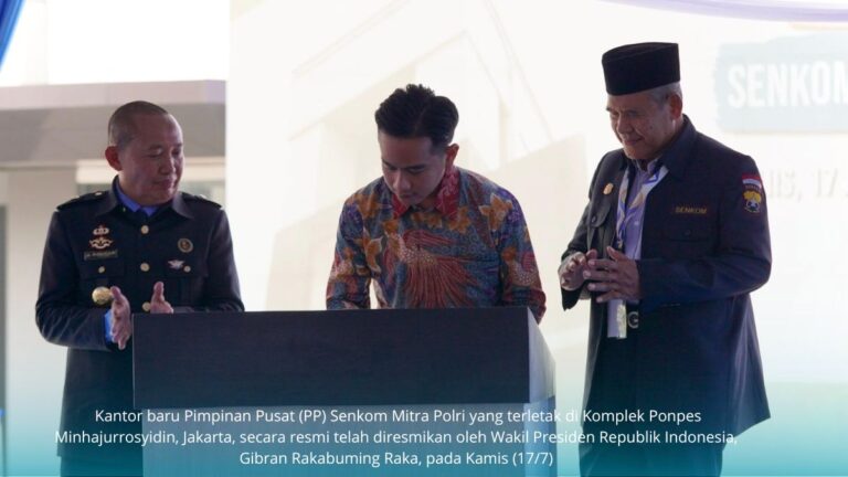Jakarta (18/7). Kantor baru Pimpinan Pusat (PP) Senkom Mitra Polri yang terletak di Komplek Ponpes Minhajurrosyidin, Jakarta, secara resmi telah diresmikan oleh Wakil Presiden Republik Indonesia, Gibran Rakabuming Raka, pada Kamis (17/7) kemarin. Dalam sambutannya, Wapres berharap gedung tersebut menjadi simbol semangat baru untuk memperkuat solidaritas dan sinergi antara Senkom dengan pemerintah.