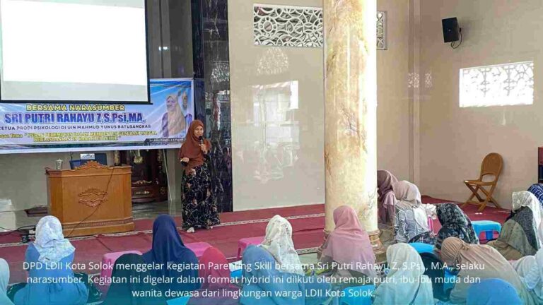 Kota Solok (29/7). DPD LDII Kota Solok menggelar kegiatan Parenting Skill bersama Sri Putri Rahayu Z, S.Psi., M.A., selaku narasumber. Kegiatan ini digelar dalam format hybrid ini diikuti oleh remaja putri, ibu-ibu muda dan wanita dewasa dari lingkungan warga LDII Kota Solok.