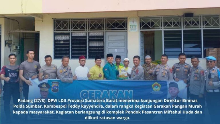 Padang (30/8). DPW LDII Provinsi Sumatera Barat menerima kunjungan Direktur Binmas Polda Sumbar, Kombespol Teddy Rayyendra, dalam rangka kegiatan Gerakan Pangan Murah kepada masyarakat. Kegiatan berlangsung di komplek Pondok Pesantren Miftahul Huda Pada rabu (27/8) lalu.