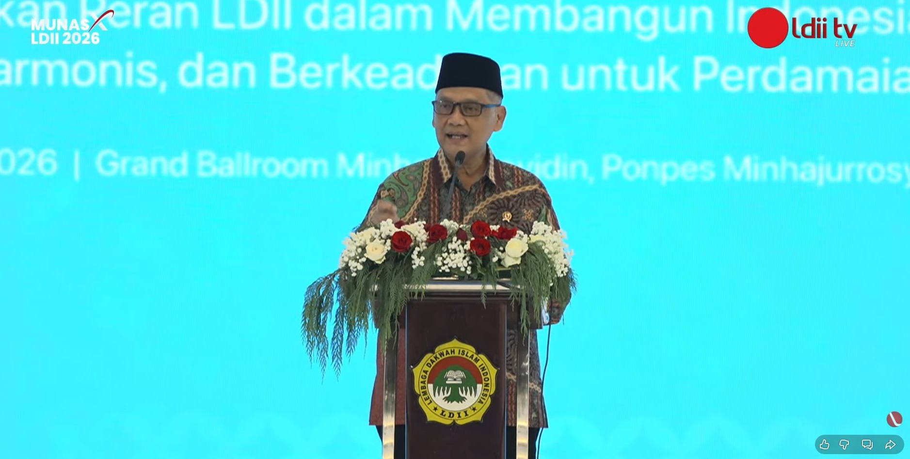 Jakarta (7/4). Menteri Haji dan Umroh (Menhaj) Republik Indonesia, KH. Mochamad Irfan Yusuf meminta LDII agar menjadi jembatan antara kebijakan pemerintah dan masyarakat. Hal itu ia ungkapkan saat memberikan materi pada Munas X LDII hari pertama, di Grand Ballroom Minhaajurrosyidiin, Ponpes Minhaajurrosyidiin, Jakarta, pada Selasa (7/4/2026).